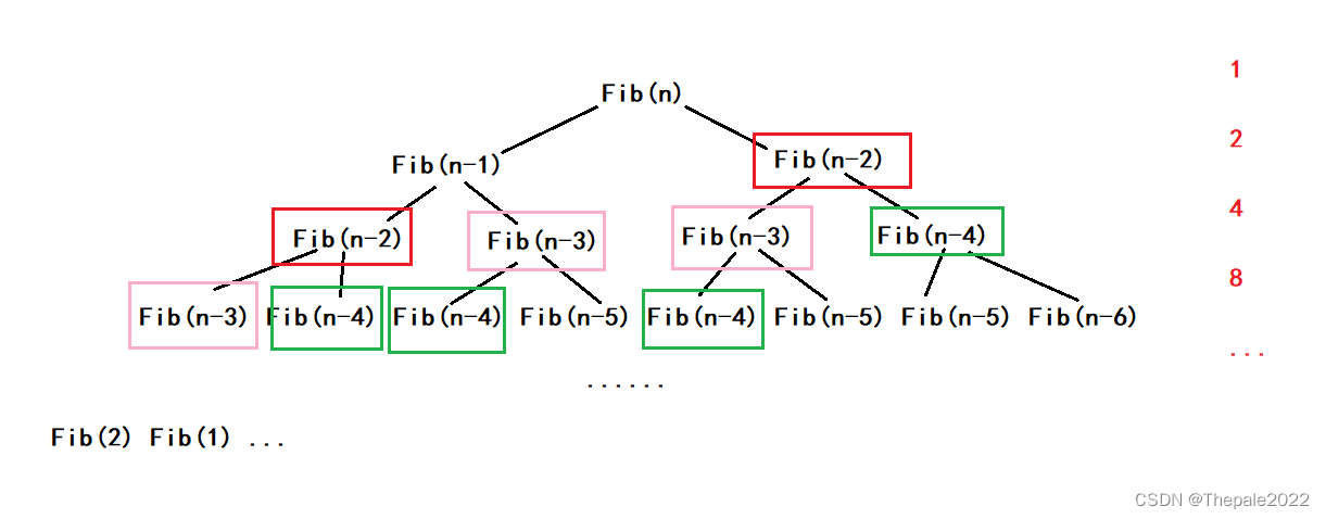 其时间复杂度在 N 为 30 时, 计算次数直接达到了 10 亿次,可知其递归的弊端;从图中也不难看出,是因为递归进行了大量的重复运算,例如图中方框部分及更多: