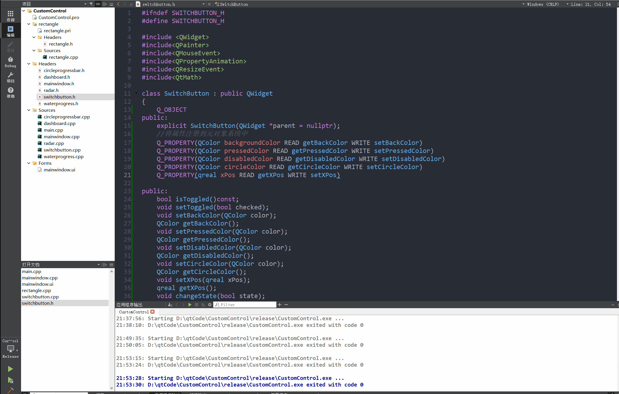 QWidget实现开关按钮 首先是使用Q_PROPERTY将开关按钮的属性注册到Qt的元对象系统重,方便后续将开关控件集成到QtDesigner设计师界面中:如下是开关控件的属性:在绘制时,首先将上面属性中的颜色初始化://设置选中和未被选的画笔颜色elseelse//绘制外部大圆//绘制内圆绘制效果如下://鼠标点击(左键点击)else//鼠标松开checked =!checked;//改变状态//状态改变后,更改动画效果else//状态改变函数。