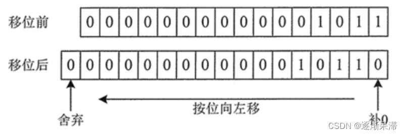 从图中可以看到,原来数的所有二进制位都向左移动 1 位。原来位于左边的最高位 0 被移出舍弃,再向尾部追加 0 补位。最终到的结果是 22,相当于原来数的 2 倍。