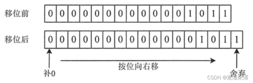 从图中可以看到,原来数的所有二进制位都向右移动 1 位。原来位于右边的最低位 1 被移出舍弃,再向最高位追加 0 补位。最终到的结果是 5,相当于原数整除 2 的结果。