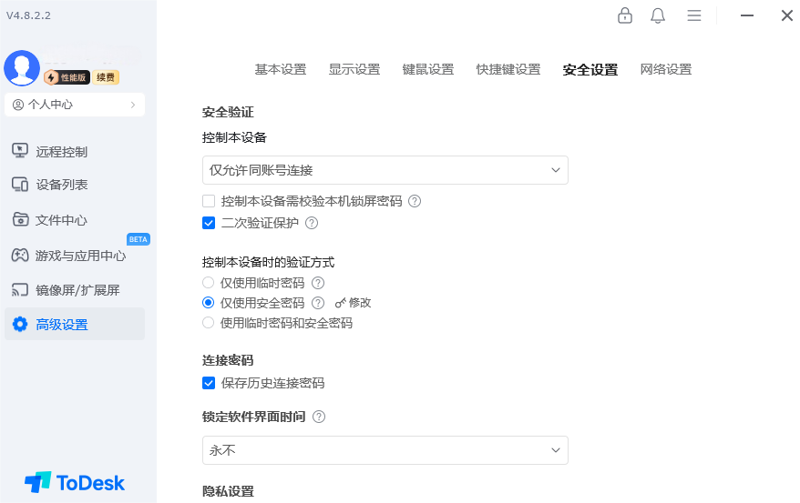 提到远程控制,大家第一想法是不是不安全?害怕自己的电脑被人远程操控、重要信息泄露……这里就不得不提ToDesk在安全方面的一些功能,在电脑端点开高级设置-安全设置,可以自己设置各种相关权限,比如仅允许同账号连接、控制本设备仅使用安全密码验证等,还可以开启二次验证保护,启用后所有与本设备的连接需经过主设备同意。ToDesk在安全方面的功能比较完善,大家可以放心使用。