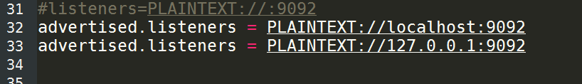 在文件第31行 #listeners=PLAINTEXT://:9092 下面加入下面两行内容
