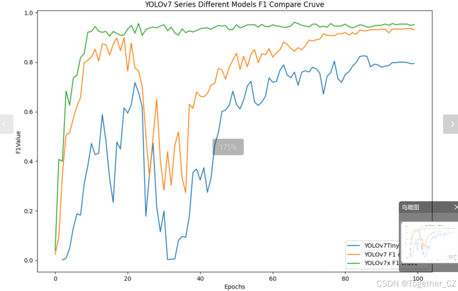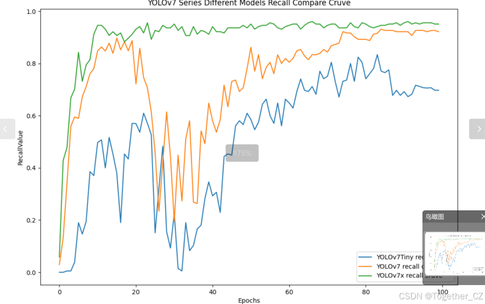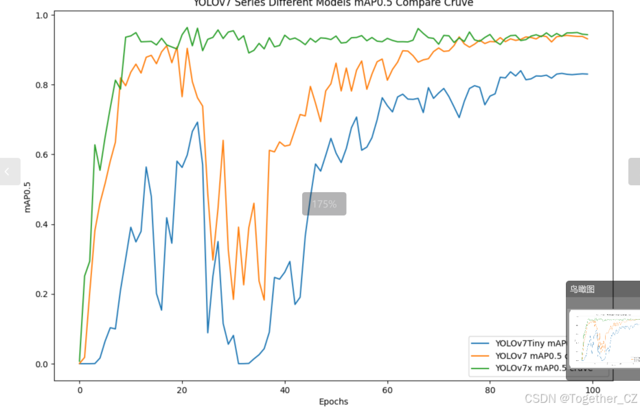 综合实验对比分析结果来看:随着实验训练迭代次数的增加,三款不同参数量级的模型都不断提升精度,最终达到了十分相近的效果,这里综合考虑最终选择使用yolov7tiny模型来作为最终的推理模型。