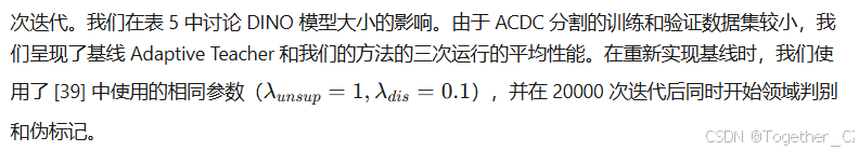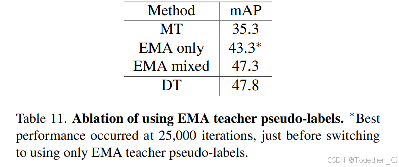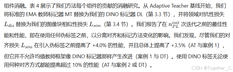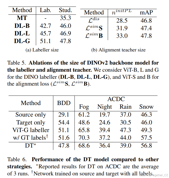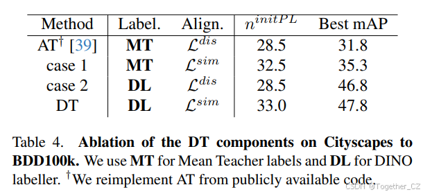 表 4.DINO Teacher 组件的消融研究,从 Cityscapes 到 BDD100k。我们使用 MT 表示均值教师标签,DL 表示 DINO 标记器。†我们从公开代码重新实现了 AT。