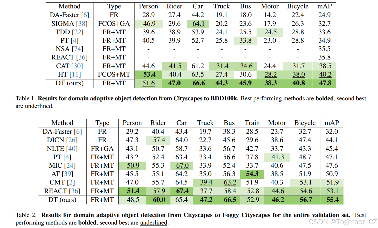 我们将我们的方法与其他最先进方法的性能进行比较,并报告在 50% IoU 下的类别平均精度(mAP@50)。在表格中,我们使用以下缩写:FR 表示 Faster R-CNN,GA 表示图对齐,MT 表示均值教师。我们在不同的环境、相机和恶劣天气条件下进行评估。