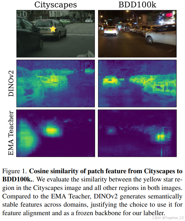 另一种常见的领域适应策略是领域不变性。这最初被表述为一种对抗性损失,它推动图像级别的主干特征不包含任何领域信息。其他方法通过直接最小化源域和目标域特征表示之间的距离度量来获得领域不变特征。其中一些距离度量包括对比损失、图对齐或最优传输。最简单的不变性或对齐方法在图像级别上操作,但无法保证图像级别的对齐会导致检测和分割任务所需的实例级别对齐。或者,可以将对齐方法与上述自标记方法结合起来,允许实例级别和类别条件对齐。然而,将对齐项与自标记耦合会导致一种困境:需要良好的标签来进行稳健的对齐,但领域对齐也是生成良好标签所需要的。相反,我们提出通过鼓励学生模型的特征空间与自监督 VFM 在源图像和目标图像上的特征空间相似,间接对齐领域,而无需任何标签。