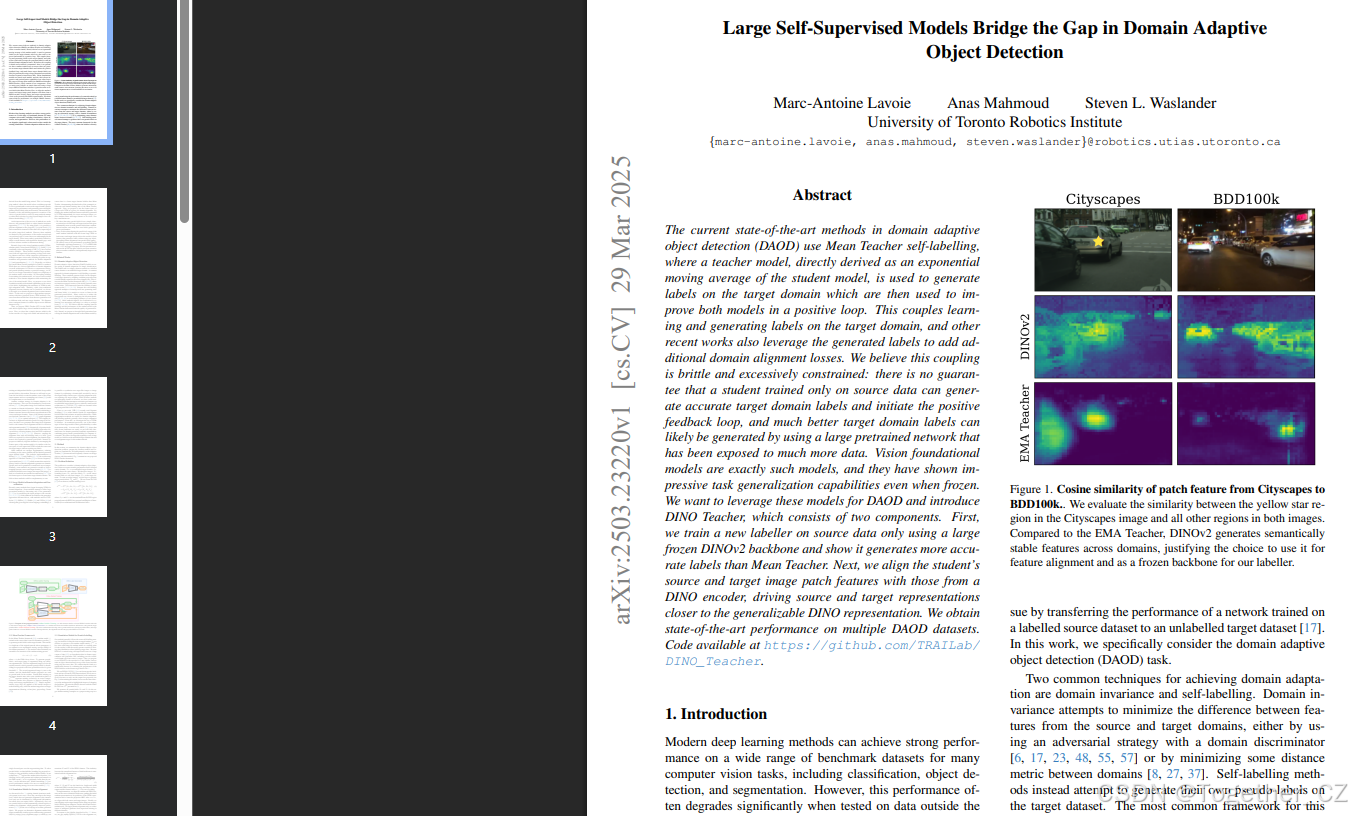 这篇文章的核心贡献在于提出了一种新的 DAOD 方法,通过利用大型视觉基础模型的泛化能力,显著提高了在不同领域之间进行目标检测的性能。这里是自己的论文阅读记录,感兴趣的话可以参考一下,如果需要阅读原文的话可以看这里,如下所示: