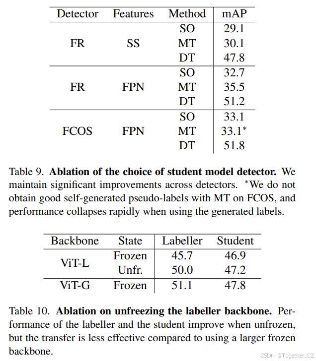 在主论文中,我们考虑了最简单的设置,即保持标记器 ViT 主干冻结,维护预训练的 DINOv2 权重,并在表 5a 中展示了标记器主干大小和性能的影响。在这里,我们考虑了解冻标记器主干的情况,并在源图像上与检测器一起训练。我们通常遵循第 4.2 节中的训练方案,但将主干的学习率缩小了 0.01 倍。我们在表 10 中展示了在 Cityscapes 图像上训练的标记器在未标记的目标 BDD 上的性能,以及使用标记器伪标签在 BDD 上训练的 VGG 学生的性能。我们发现,尽管解冻主干使标记器的性能显著提升(+4.3%),但对学生的改进较小(+0.3%)。我们发现,由于解冻而导致的标记器性能提升并没有像使用更大的冻结主干那样有效地转移到学生模型上。