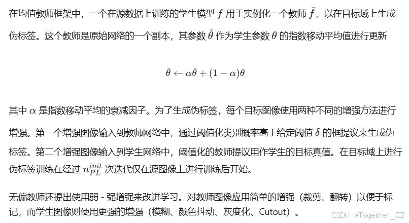 实现领域适应的两种常见技术是领域不变性和自标记。领域不变性试图最小化源域和目标域特征之间的差异,要么通过使用对抗策略与领域判别器,要么通过最小化某些领域之间的距离度量。自标记方法则尝试为目标数据集生成自己的伪标签。最常见的框架是均值教师,其中标记器直接从正在训练的模型中派生。这是一种引导方法,模型选择置信度高的提议作为目标域的训练真值,从而提高其性能,并在下一次迭代中生成更多和更高质量的伪标签。由于这种自标记方法的性能对用于训练的伪标签的选择非常敏感,许多方法尝试通过超越简单的类别置信度阈值来细化标签选择。