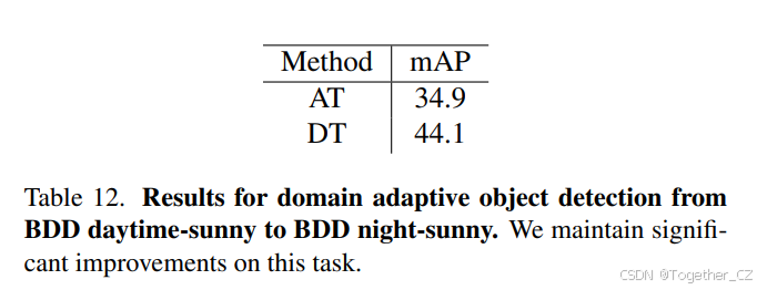 我们考虑了白天晴朗和夜间晴朗分割,它们的图像数量相似,分别有 19{,}395 张训练图像和 8{,}313 张测试图像用于白天晴朗,以及 18{,}310 张训练图像和 7{,}848 张测试图像用于夜间晴朗。这个测试案例类似于 Cityscapes → Foggy Cityscapes,但数据集更大且领域差距是非合成的。我们使用第 4.2 节中描述的 VGG16 主干的训练协议。由于我们使用了新的源数据集,我们训练了一个新的 ViT-L DINO 标记器用于白天晴朗分割。我们在表 12 中展示了 Adaptive Teacher 基线(AT)和我们的 DINO Teacher(DT)的结果。与从 Cityscapes 到 BDD100k Daytime 的领域适应类似,我们发现 DINO Teacher 在目标数据集上带来了显著的改进,达到了 +9.2%。