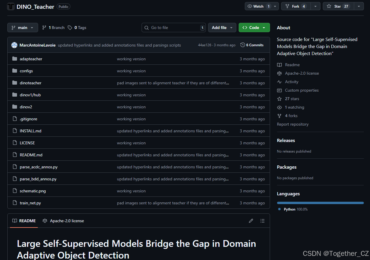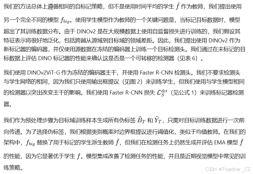 DINO 标记器(Labeller):使用 DINOv2 作为主干网络,仅在源数据上训练一个检测头,生成目标域的伪标签。这种方法比传统的均值教师方法更准确,因为它利用了 DINOv2 在大规模数据上预训练的泛化能力。