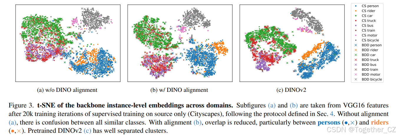 为此,我们使用 VFM 的特征表示作为我们的对齐目标。同样,我们假设 DINOv2 特征将更好地泛化到目标域,并且任何特定对象类别的表示将比仅在源数据上训练的小学生模型的表示在领域之间更好地定义。为了改进学生,我们提出将学生主干的图像块级特征与冻结的 DINOv2 编码器在源域和目标域的单个图像上的特征进行对齐。这推动学生对两个领域的表示更接近大型模型的表示,减少领域差距。我们在图 3 中使用 t-SNE 比较了学生网络的实例级特征聚类与 DINOv2 对齐以及原始 DINOv2 聚类。这表明 DINO 特征具有更好的稀有类别分离,并且将学生与 DINOv2 对齐可以改善在源域 Cityscapes 和目标域 BDD 上的分离。