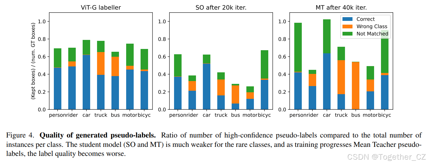 为了探讨这一点,图 4 展示了在目标 BDD 数据集上,置信度值高于阈值 δ=0.8(因此保留为标签)的伪标签数量与给定类别实际实例数量的比率,用于三个标记器:我们的 ViT-G DINO 标记器、在 nPLinit=20,000 次迭代(当开始均值教师伪标签生成时)的源数据 VGG 学生,以及在 40{,}000 次迭代时的均值教师 EMA 教师。我们观察到,源数据学生是一个糟糕的罕见类别标记器,如卡车、公交车和摩托车,这种糟糕的初始性能导致随着训练的继续标签变得更差。我们看到常见类别(如汽车)的置信度高的框增加,这些框与罕见类别框匹配(橙色线条为卡车和公交车)或与任何真实实例不匹配(汽车上的绿色条)。