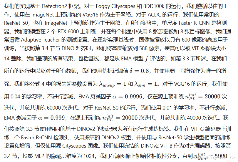 我们在第 4.3 节的主结果中使用 VGG16 作为主干网络进行 Foggy Cityscapes 和 BDD100k 的领域适应,遵循以往的工作。然而,我们在 ACDC 上的实验选择了 ResNet-50,因为这是更常见的架构。同样,较小的 ViT-S 架构与 VGG 大小相似,并且在使用更好的初始化(如 DINOv2 的蒸馏权重)时通常是一个更强的基线。