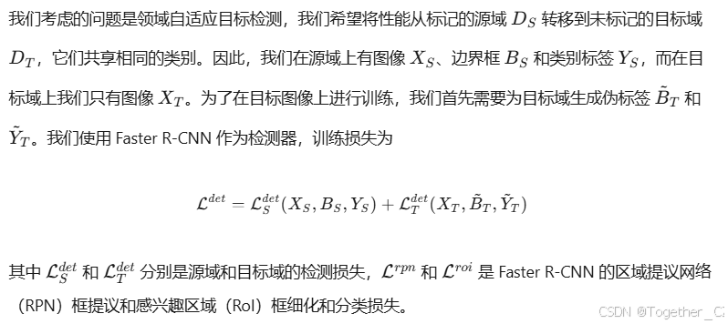 领域自适应目标检测(DAOD):在计算机视觉中,模型在标记的源数据集上训练,然后需要在未标记的目标数据集上进行测试。由于源域和目标域之间的分布差异,模型在目标域上的性能往往会显著下降。领域适应的目标是通过某种方式将源域的性能迁移到目标域。