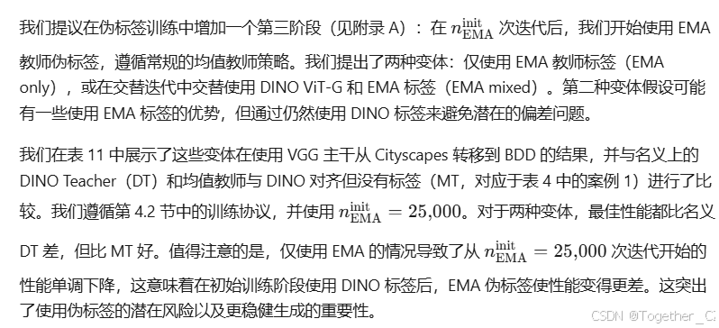 我们的方法与均值教师基线的主要区别在于,我们使用 DINO 标记器而不是 EMA 教师生成目标伪标签,从而获得了更好的性能。然而,在许多情况下(较小的标记器在表 5b 中,ACDC 雾和雪分割,更大的学生主干和检测器),从接触目标数据的学生派生的教师模型表现优于仅在源数据上训练的标记器。因此,我们研究了是否可以将 EMA 教师标签与使用 DINO 标记器结合起来。