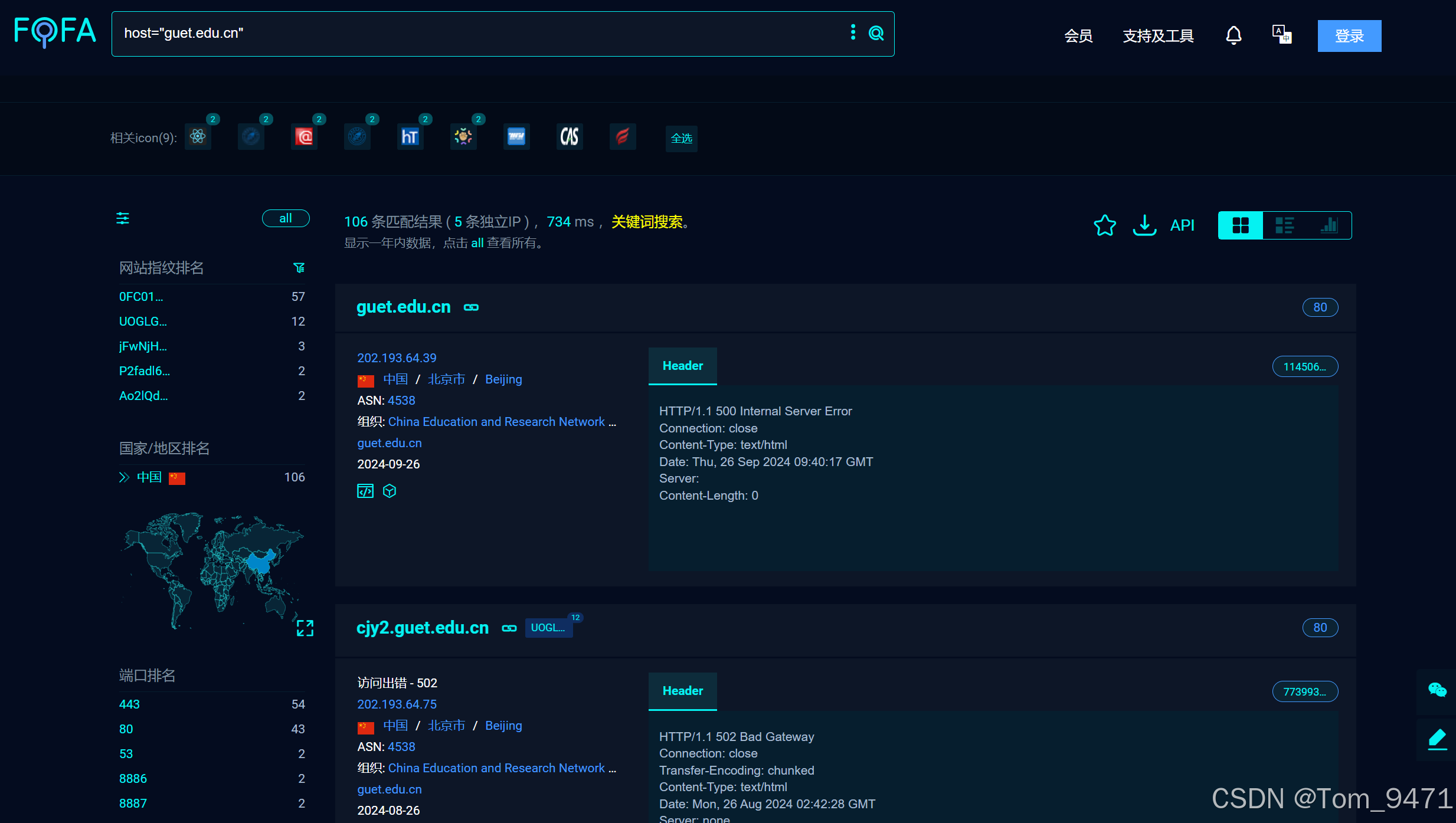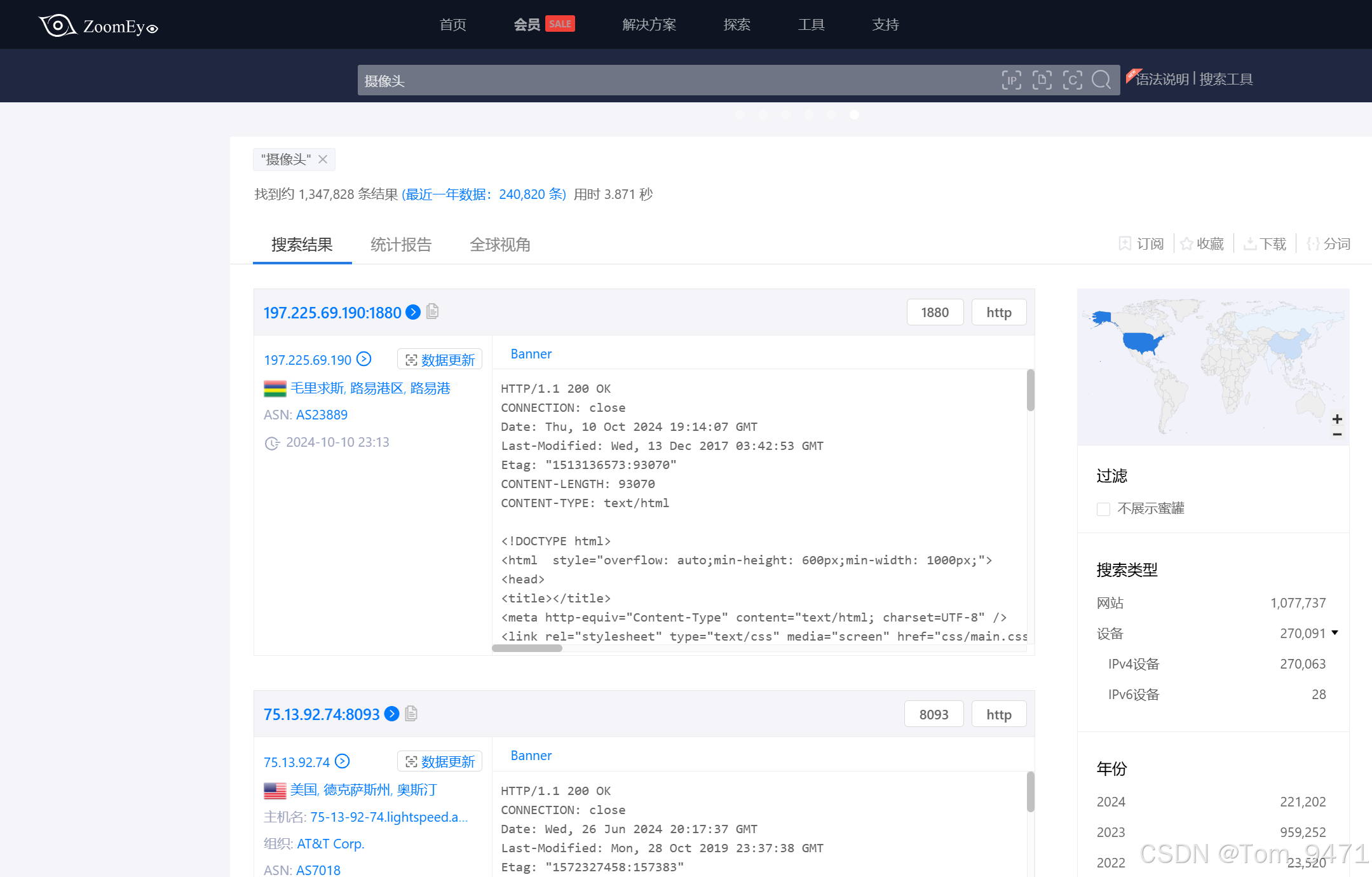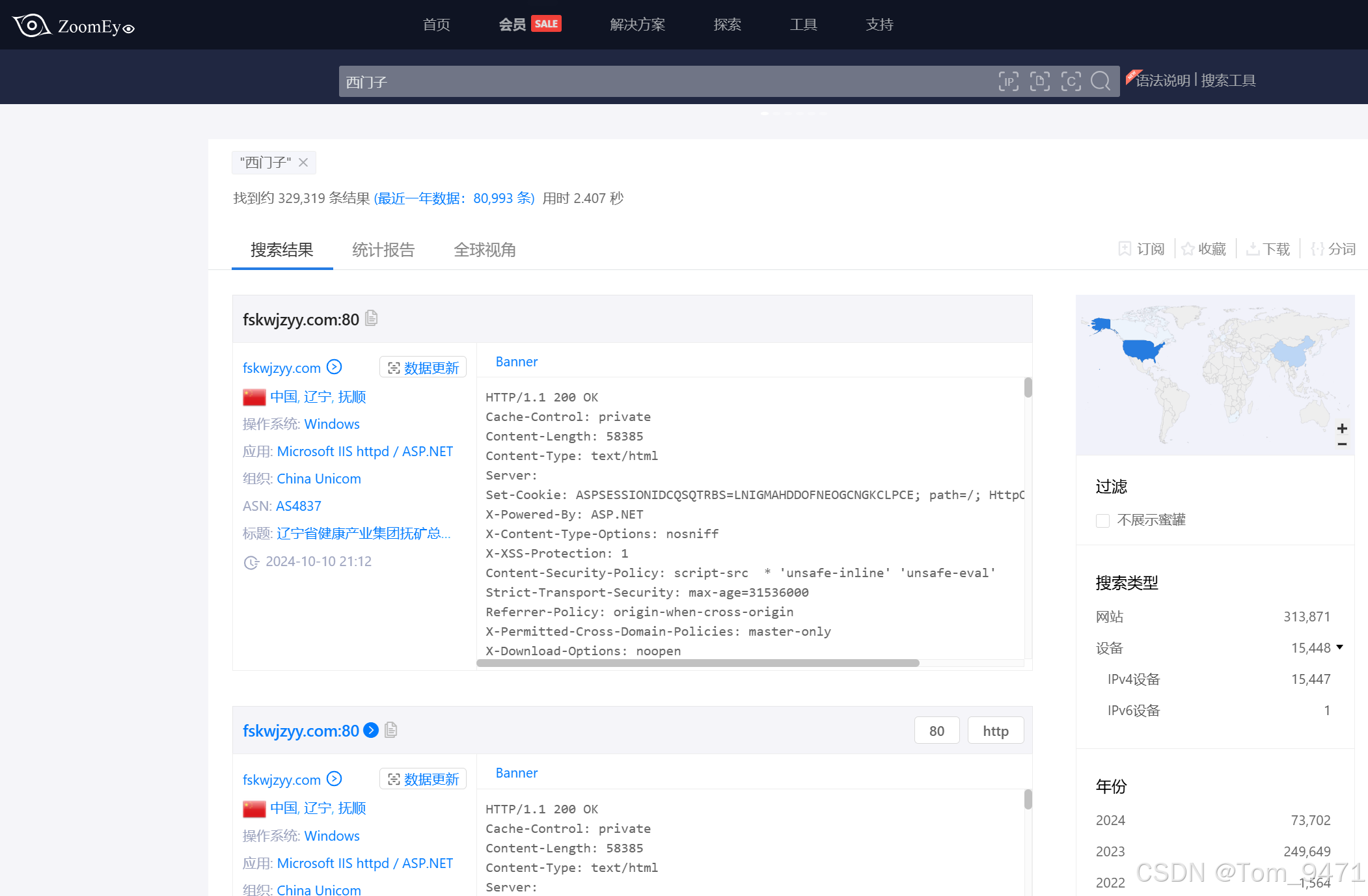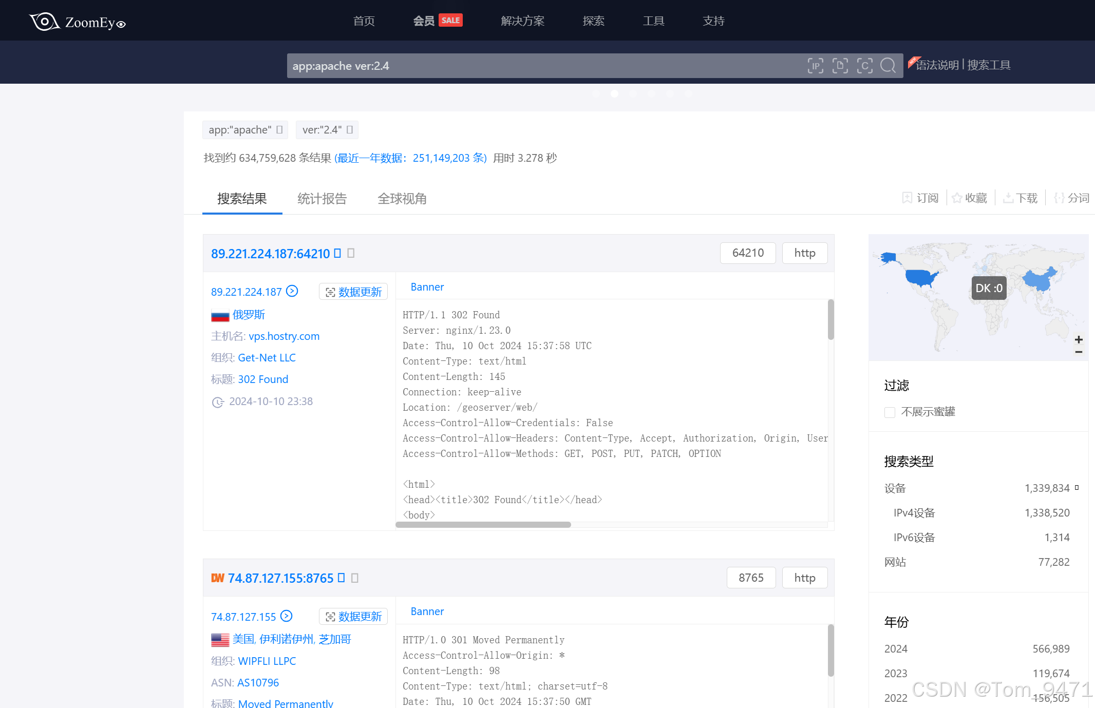 与常规搜索引擎不同的是,ZoomEye 能够扫描互联网上的设备,并索引其开放的服务和端口信息,帮助研究人员和网络管理员发现和监控网络资产。(https://www.zoomeye.org/)