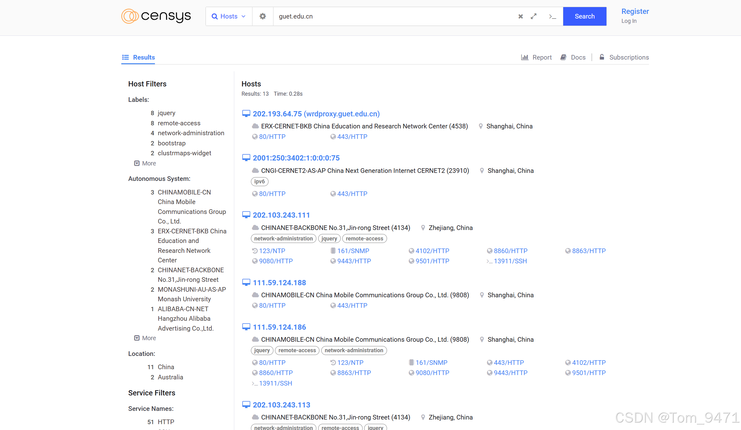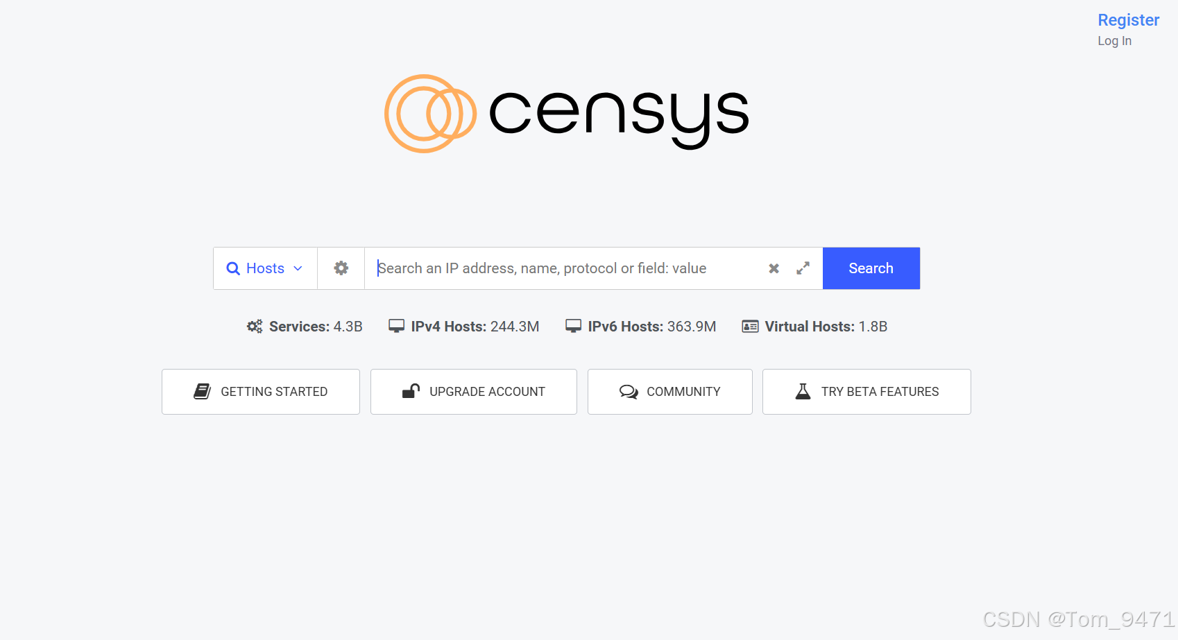 2. Censys:由密歇根大学的研究人员开发,类似于Shodan,专注于扫描IPv4地址空间,收集有关主机和服务的信息。(https://search.censys.io/)