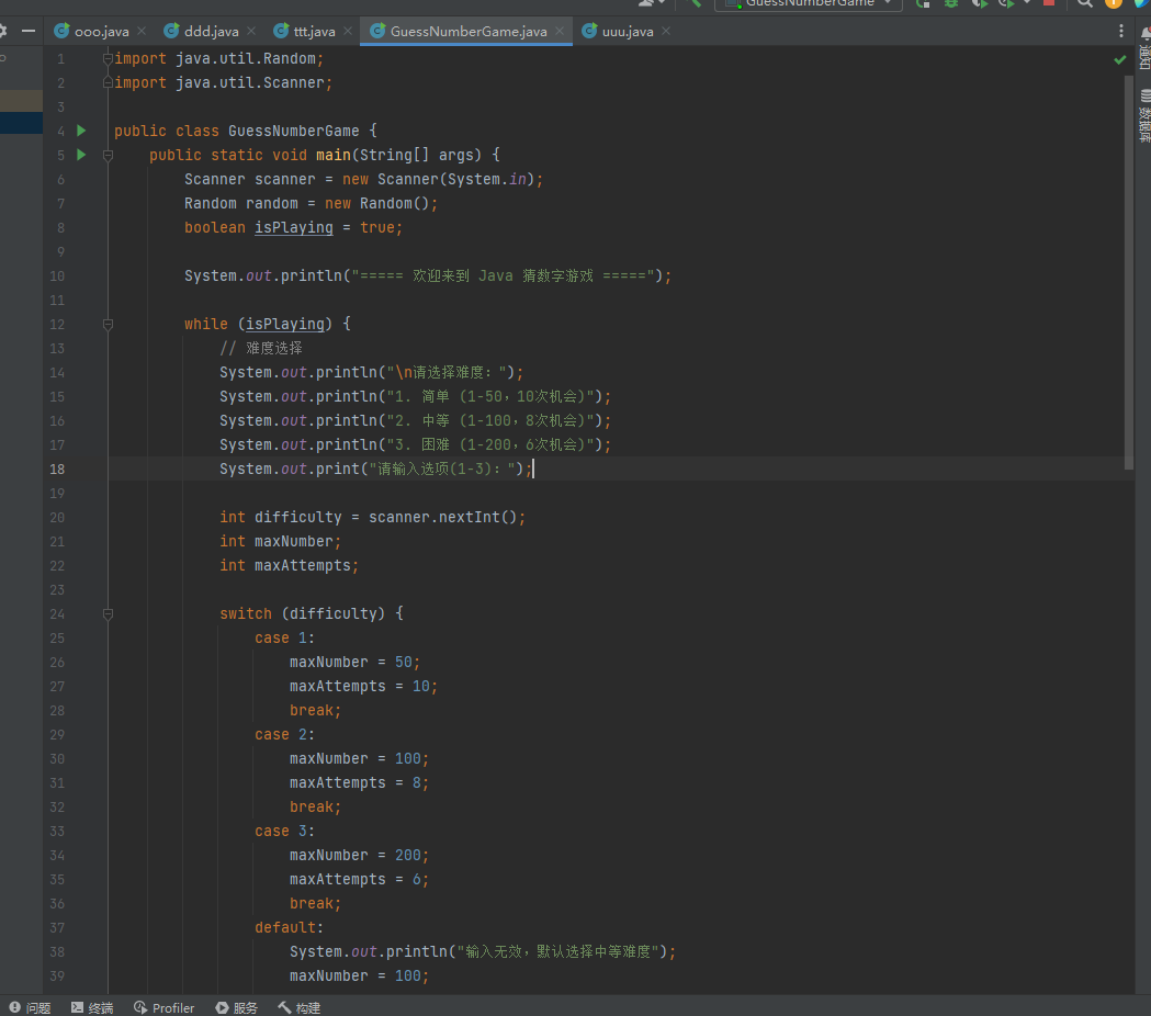 import java.util.Random; import java.util.Scanner; public class GuessNumberGame { public static void main(String[] args) { Scanner scanner = new Scanner(System.in); Random random = new Random(); boolean isPlaying = true; // 控制游戏是否继续 System.out.println("===== Java 猜数字游戏 ====="); while (isPlaying) { // 1. 选择难度 System.out.println("\n请选择难度:"); System.out.println("1. 简单(1-50,10次机会)"); System.out.println("2. 中等(1-100,8次机会)"); System.out.println("3. 困难(1-200,6次机会)"); System.out.print("请输入选项(1-3):"); int difficulty = scanner.nextInt(); int maxNum; // 最大数字范围 int maxAttempts; // 最大猜测次数 // 根据难度设置参数 switch (difficulty) { case 1: maxNum = 50; maxAttempts = 10; break; case 2: maxNum = 100; maxAttempts = 8; break; case 3: maxNum = 200; maxAttempts = 6; break; default: System.out.println("输入无效,默认选择中等难度"); maxNum = 100; maxAttempts = 8; } // 2. 生成目标数字(1到maxNum之间) int target = random.nextInt(maxNum) + 1; boolean isWon = false; System.out.println("\n游戏开始!我已生成一个1-" + maxNum + "之间的数字"); System.out.println("你有" + maxAttempts + "次猜测机会,加油!"); // 3. 猜测循环 for (int attempt = 1; attempt <= maxAttempts; attempt++) { System.out.print("第" + attempt + "次猜测,请输入数字:"); int guess = scanner.nextInt(); // 判断猜测结果 if (guess < target) { System.out.println("太小了!再试试更大的数字"); } else if (guess > target) { System.out.println("太大了!再试试更小的数字"); } else { System.out.println("\n恭喜你!猜对了!答案就是" + target); System.out.println("你用了" + attempt + "次就猜中了,真棒!"); isWon = true; break; // 猜对则跳出循环 } // 提示剩余次数 if (attempt < maxAttempts) { System.out.println("还剩" + (maxAttempts - attempt) + "次机会"); } } // 4. 游戏结束判断 if (!isWon) { System.out.println("\n很遗憾,次数用完了!正确答案是:" + target); } // 5. 询问是否再来一局 System.out.print("\n想再玩一次吗?(输入1继续,其他数字退出):"); int continueChoice = scanner.nextInt(); if (continueChoice != 1) { isPlaying = false; System.out.println("谢谢参与,再见!"); } } scanner.close(); // 关闭输入流 } }代码解析