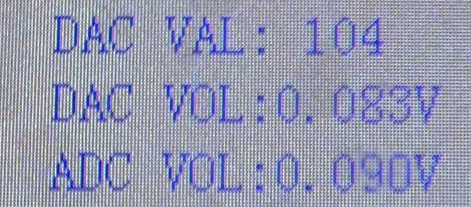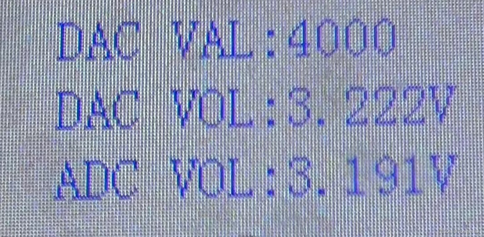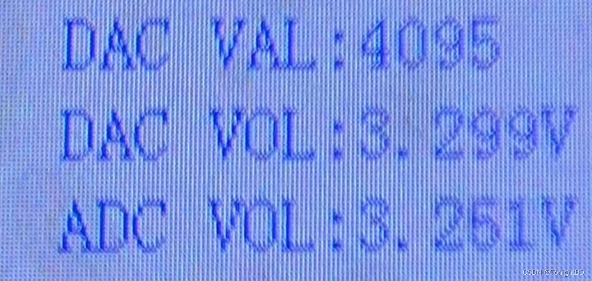提起4000,很难不联想到4096吧。细读了一遍函数 DAC_SetChannel1Data(uint32_t DAC_Align, uint16_t Data),发现它的两个参数分别表示对齐方式与存入寄存器中的数据。例程中为12位右对齐,2^12=4096,能存入的数据最大值果然与此有关。于是将例程中的4000改为4096(此时代码无法正常实现功能,仅用于验证),再次按键至最大值: