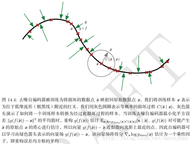 去噪自编码器(denoisingautoencoder, DAE)最小化L(x,g(f(˜ x))),其中 ˜ x 是被某种噪声损坏的 x 的副本。因此去噪自编码器必须撤消这些损坏,而不是简单地复制输入。