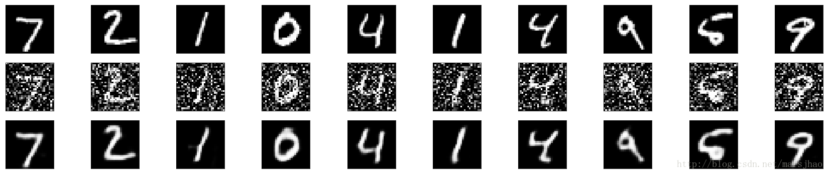 我们把训练样本用噪声污染,然后使解码器解码出干净的照片,以获得去噪自动编码器。首先我们把原图片加入高斯噪声,然后把像素值clip到0~1。