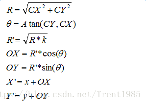 如上图所示,假设O(x,y)点为圆心,C点像素坐标相对于O点坐标为C(CX, CY),变形范围半径R长度为OC,C点变形后的点坐标为C’点,C’相对于O的位移向量(OX,OY),则C’(X’,Y’)点坐标计算如下: