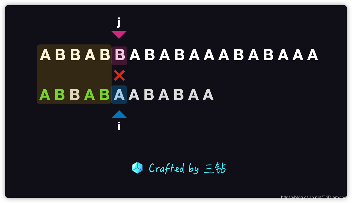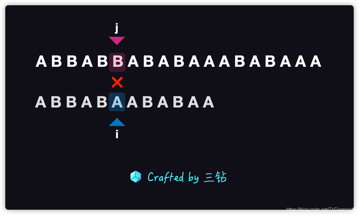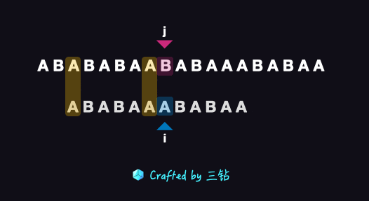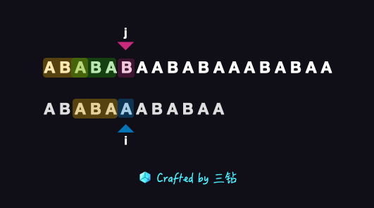 最后,我们前面讲过,如果 j 已经回溯到下标 0 还是没有发现有公共前后缀的情况。这个时候我们就不能让 j 继续回溯了,所以我们需要控制这种边界的情况,只有 j > 0 的时候才会继续回溯。如果到达了下标 0 还是没有发现公共前后缀, 那就可以让 i 往前挪动一位了。