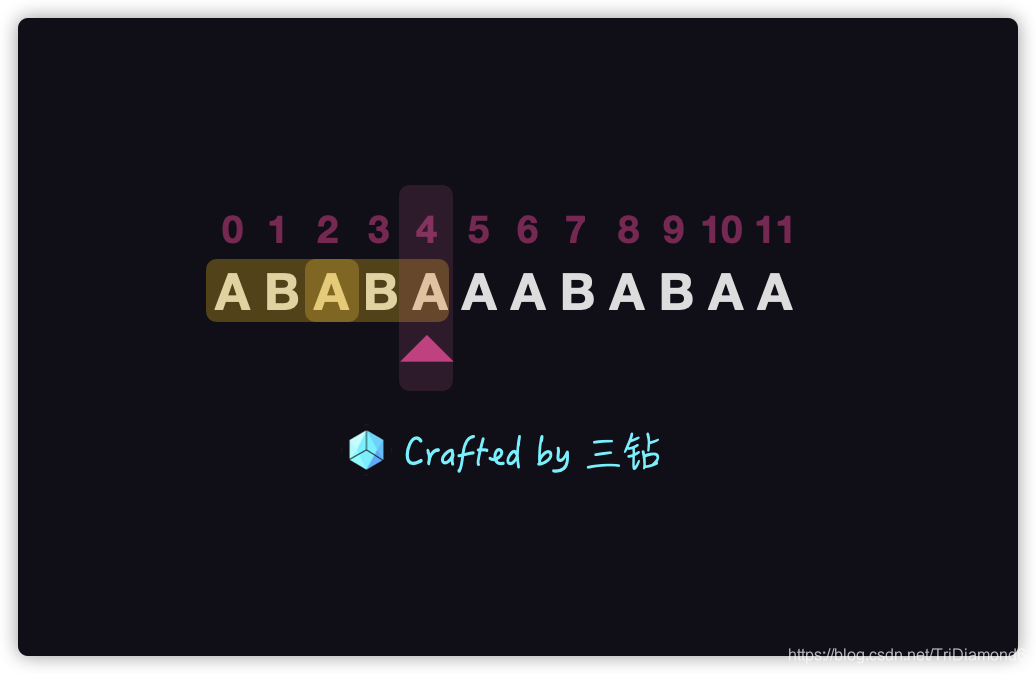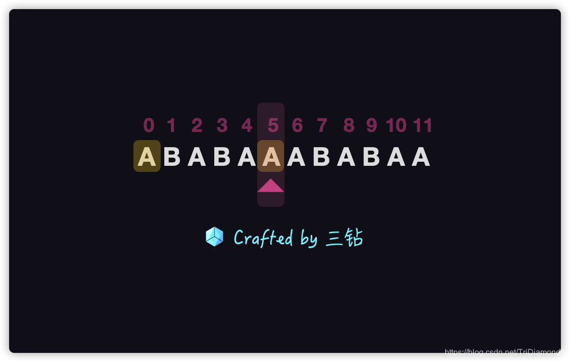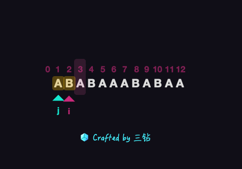 在我们上面的这个动画中,我们可以看到我们是怎么寻找最长前后缀的。在这个过程中我们找到了 3 对前后缀: