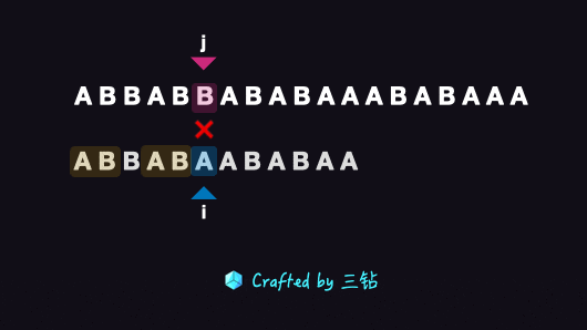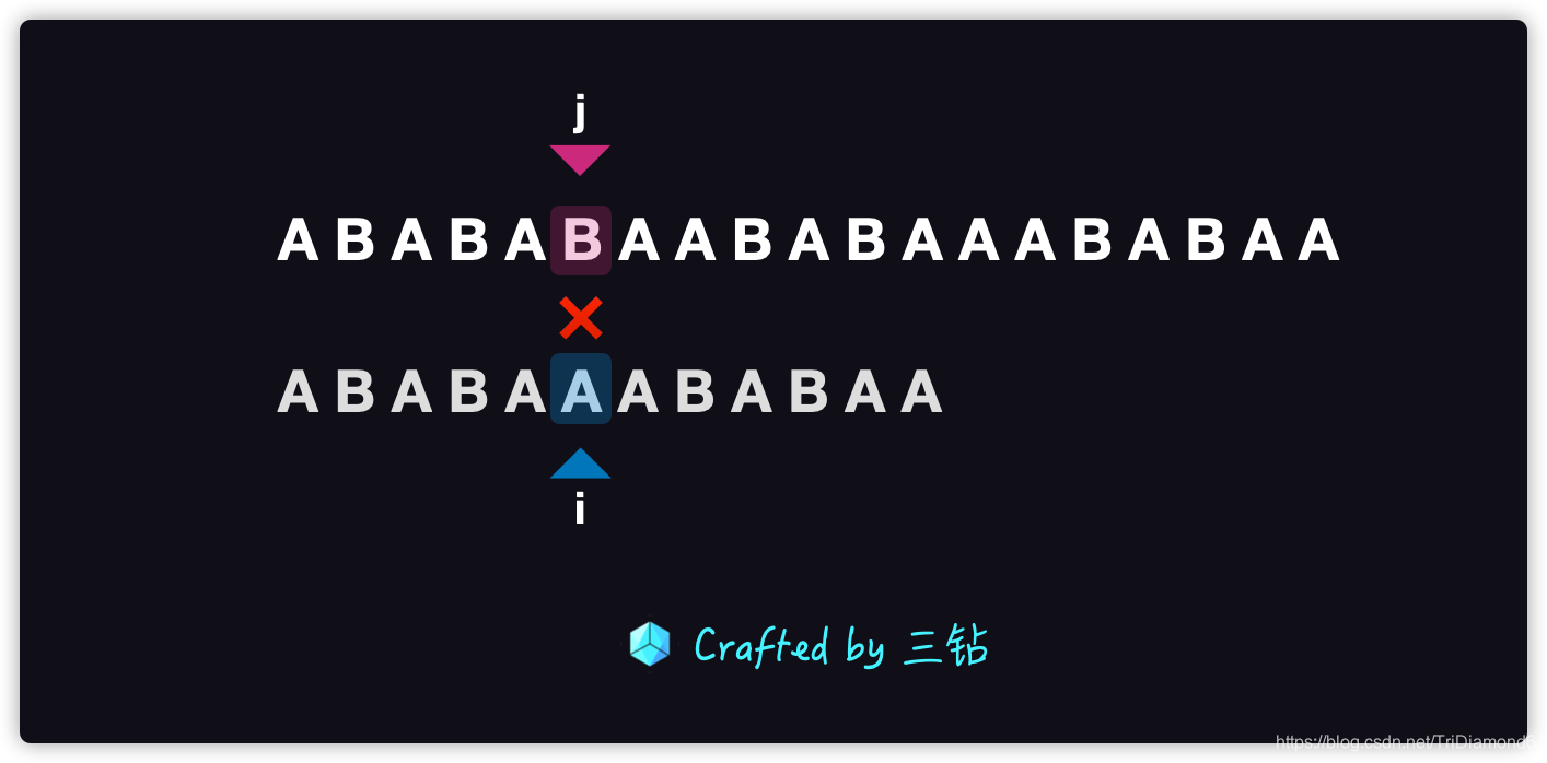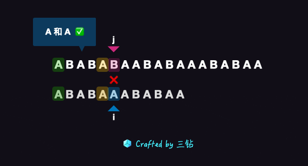 这时候我们发现这个 j 的位置对应的字符串公共前缀是对的了。说明我们这种 j 的回溯方法是对的,但是我们又发现 j 位置对应的字符与 i 现在对应的字符不对等。