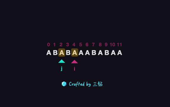 i从 1 下标开始,j从 0 下标开始,依次匹配彼此位置对应的字符。如果相同,证明 i 当前位置前面的字符拥有一个公共前后缀长度为j 下标值 + 1- 如果