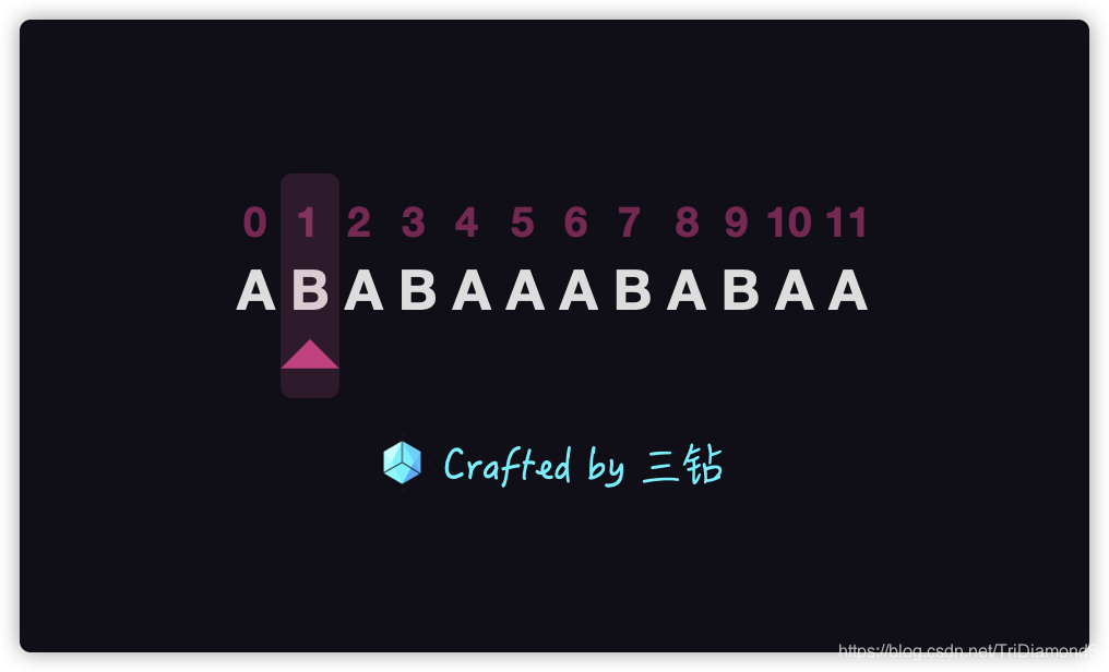注意: 这里我们是从下标 0 开始储存的,而很多学校教 KMP 算法的时候,习惯从下标 1 开始储存,但是在代码中,大多数据结构都是从下标 0 开始的,如果我们用了从 1 开始,在写代码的时候就会容易混乱。(个人觉得这也是让本来比较简单的 KMP 算法,变得很难理解的一个原因,有一些教程是从 0,有一些教程是从 1,然后在写代码的时候数组又是从下标 0 开始的。最后搞得我们脑壳疼,掉头发。)