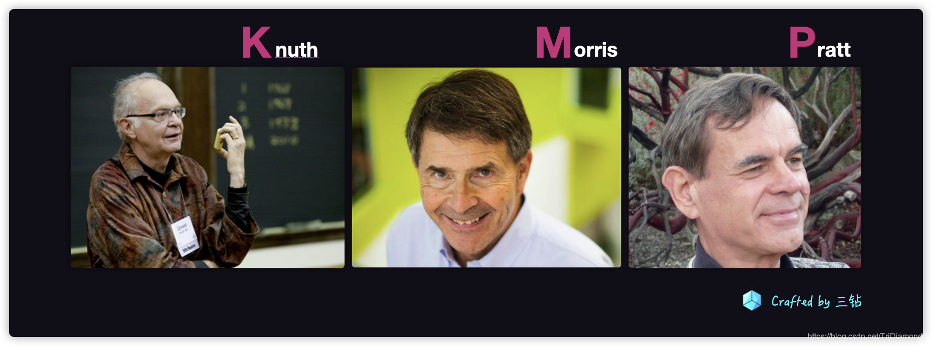 大家可能觉得 KMP 这个算法的名字很特别、很怪,因为 KMP 它并不是三个英文单词的开头,而是三个计算机科学家的名字。发明这个算法的三位计算机科学家分别为:Knuth、Morris、Pratt。第一个是大家都非常熟悉的 Donald Ervin Knuth (高德纳),他是《计算机设计艺术》的作者,也是编程界非常有名的一位老专家。然后 M 和 P 也都是当时比较著名的计算机专家,而 KMP 匹配算法就是他们三个一起研究出来的 。