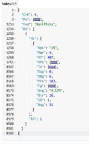 Rs是球员的结果,一杆一杆地射门。首先,我们不需要那个数组来计算每个洞的细节和那个洞的得分,由array_length(hps.Sks)决定。