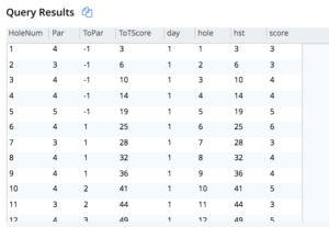 这首先按天划分分数,然后按洞的顺序划分 - 由PARTITION BY子句指定,按洞的顺序,1-18。然后,SUM将得分加起来。