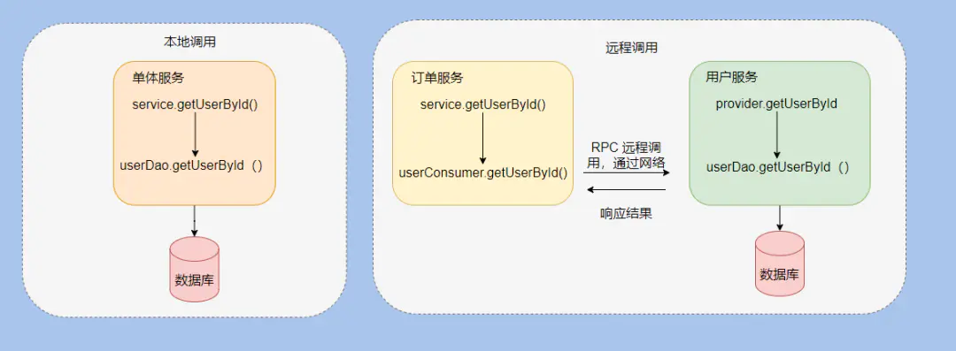 可以看到 RPC 就是通过网络进行远程调用,订单服务其实就是客户端,而用户服务是服务端。