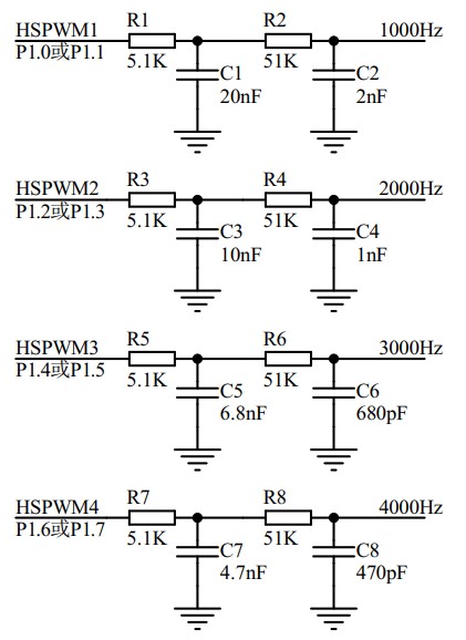 P1.6或P1.7(互补) 输出正弦波频率为4000Hz, 两节无源二阶RC滤波参数: 5.1K+4.7nF 串联 51K+470pF.