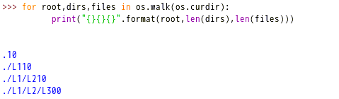 在当前文件夹下,执行os的walk方法。这个方法是一个迭代方法,对于每一级目录,返回一个三元组(root,dirs,files),分别表示当前目录的根目录,子目录和文件。迭代输出每一级目录下的根目录,文件夹数和文件数量。