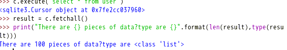 输出结果:共有100条数据,类型是<class 'list'>。创建游标之后,执行数据库建表的SQL命令,生成主键为id的user表。然后插入100条模拟数据。最后执行select查询命令,获取数据,并通过fetchall函数,返回一个python的列表,以便进一步的处理。