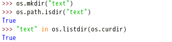 输出结果:True,True。Mkdir方法在当前目录下生成一个text目录。然后通过isdir方法判定是否为目录。通过listdir方法可以列出某个目录下所有的文件和目录。通过使用in判定text目录是否在当前目录下。