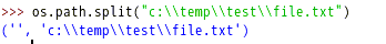 输出结果:('c:\\temp\\test', 'file.txt')。split方法返回一个元组(头,尾),其中尾部是最后一个斜杠后面的内容,其他部分归头部。