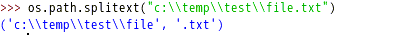 输出结果:('c:\\temp\\test\\file', '.txt')。spletext函数返回一个二元组(根,扩展),其中扩展部分是从最后一个“逗点”到最后的所有文字,忽略其中的“逗点”。扩展部分可以为空。这个方法可以获取一个文件的扩展名。