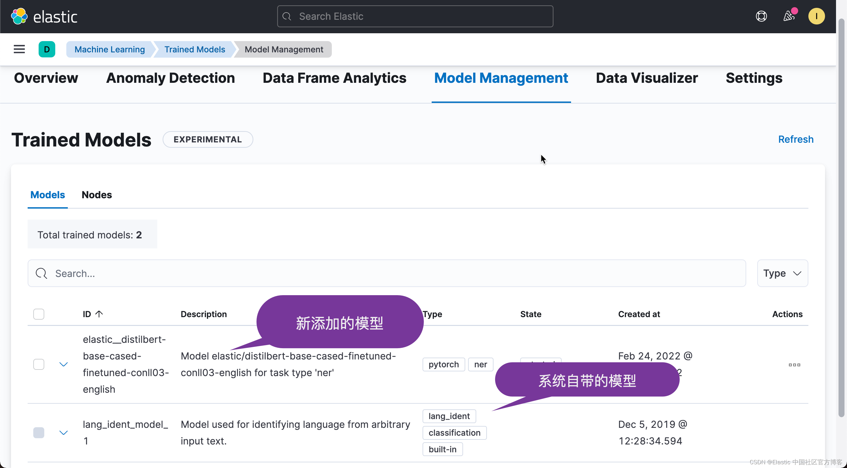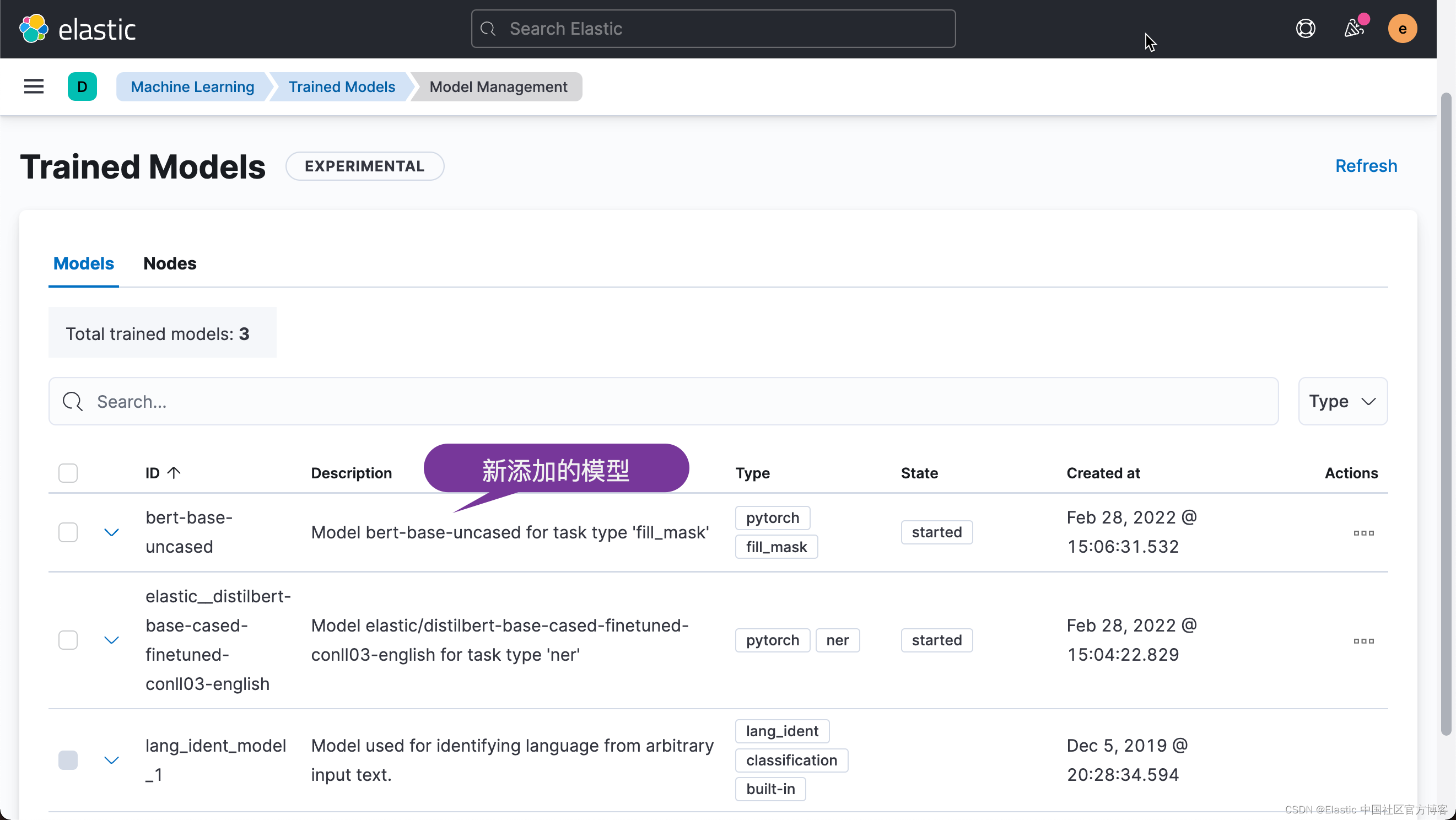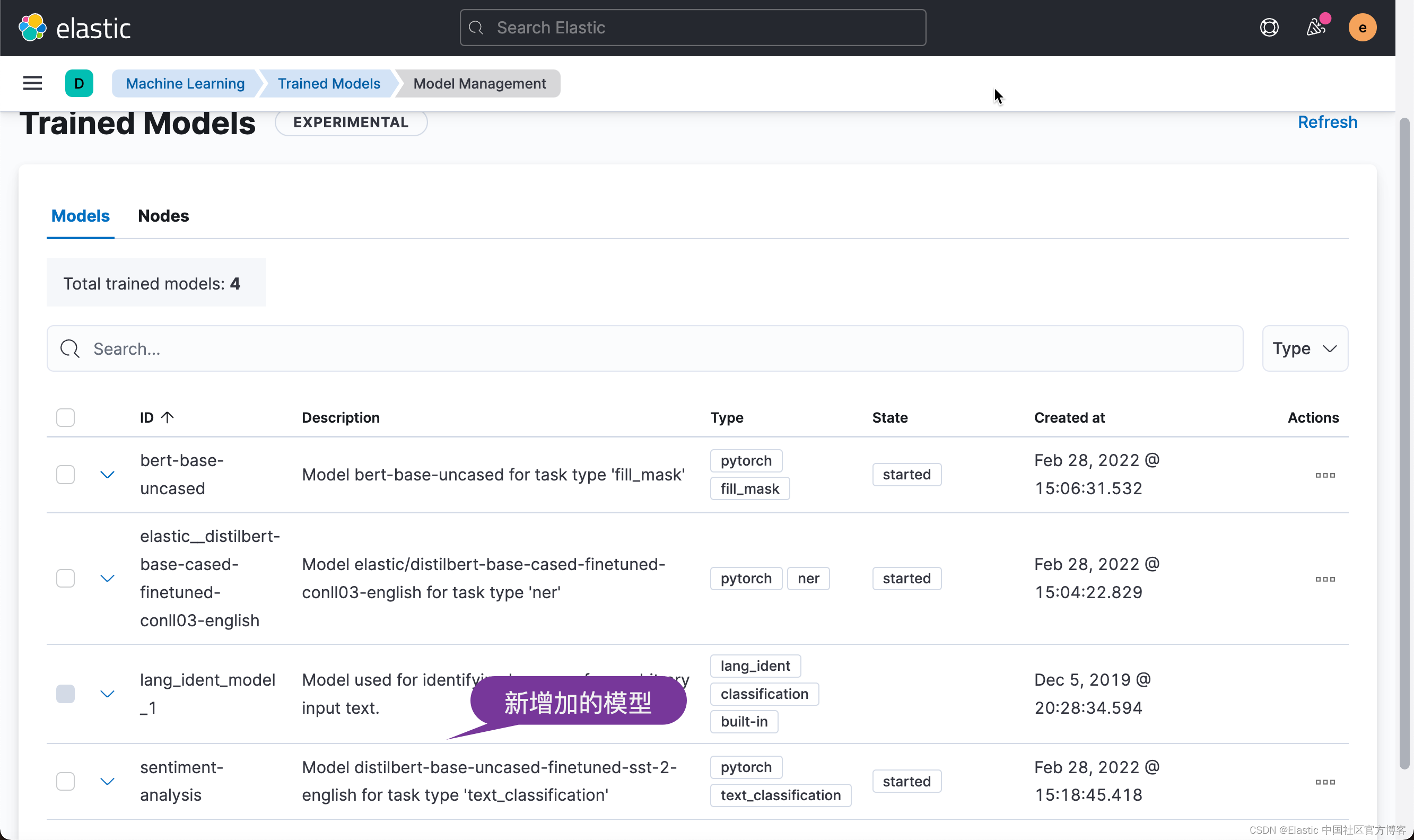 从上面的界面中,我们可以看出一个新怎讲的模型。现在我们已经成功地把模型上传到 Elasticsearch 中。