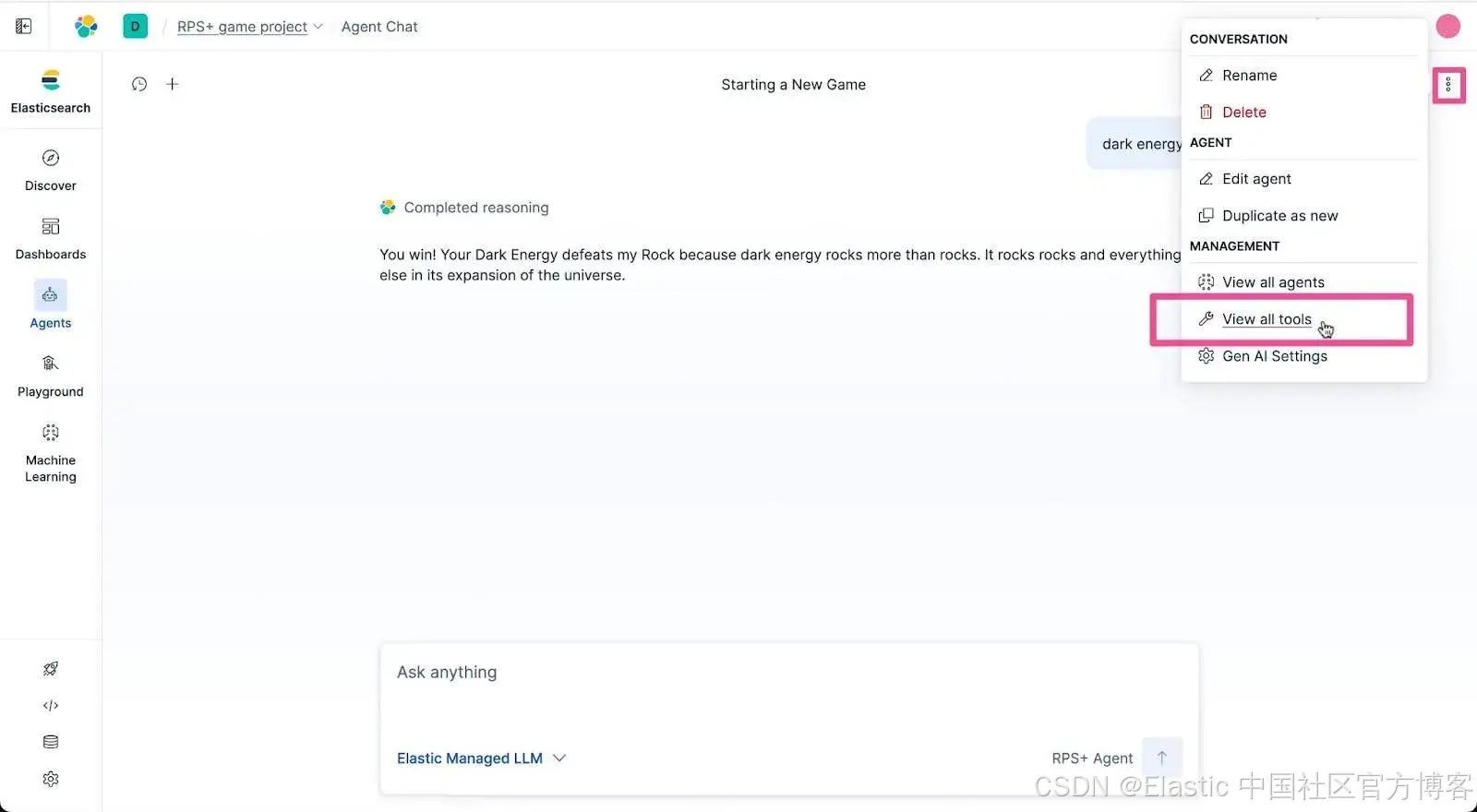 从页面右上角的 Agent Builder actions 菜单中选择 View all tools