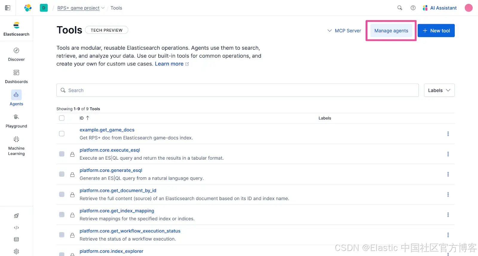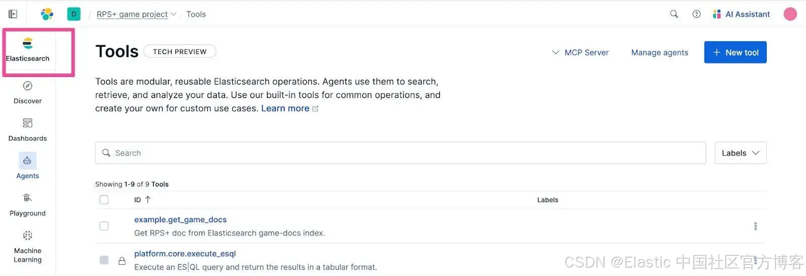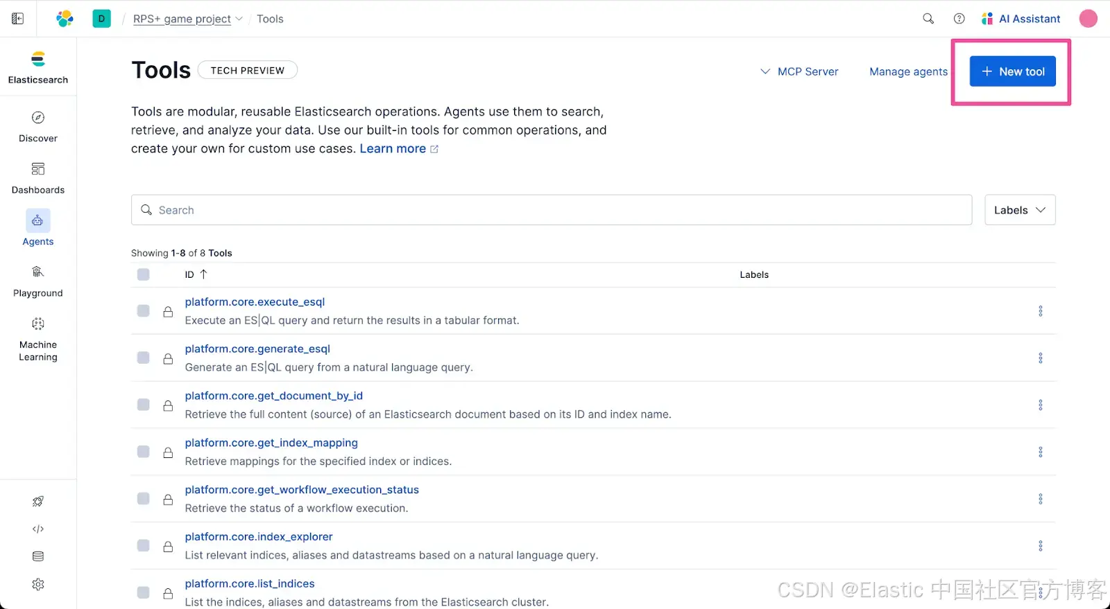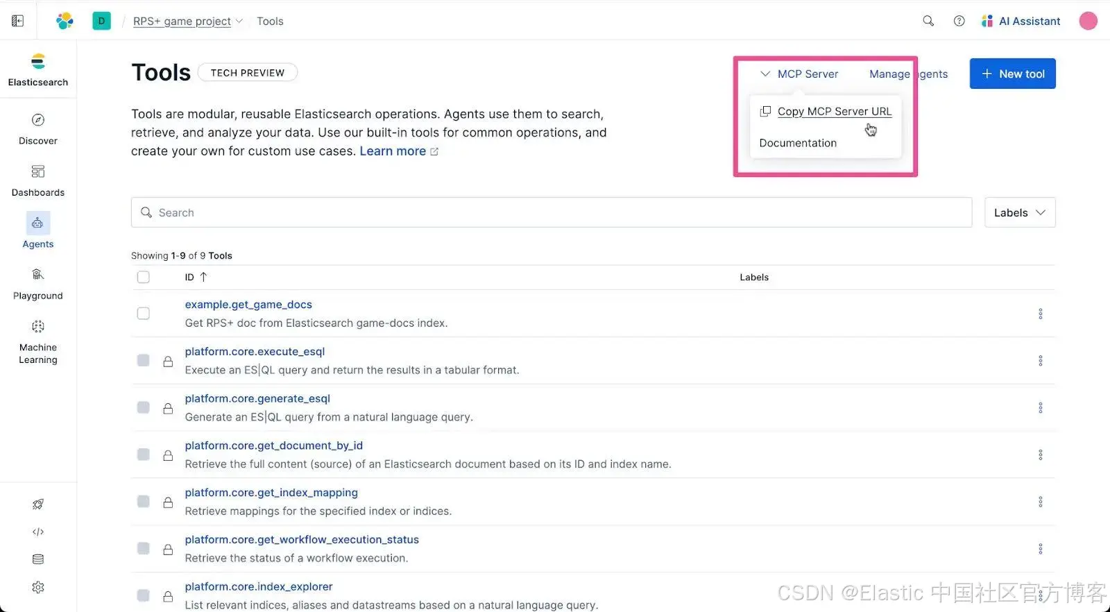 好了,我们现在在 Elastic 中已有一些数据,让我们开始使用它。Agent Builder 内置支持创建 MCP 工具,帮助 agent 访问所需数据,从而获得任务的正确上下文。让我们创建一个简单的工具来检索我们的游戏数据。