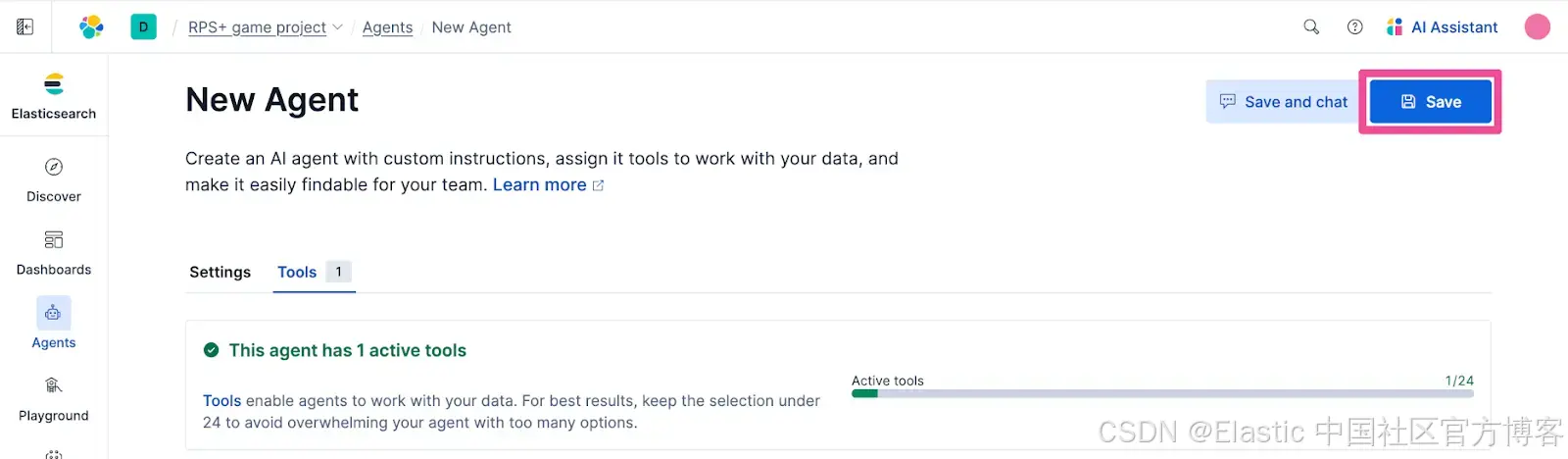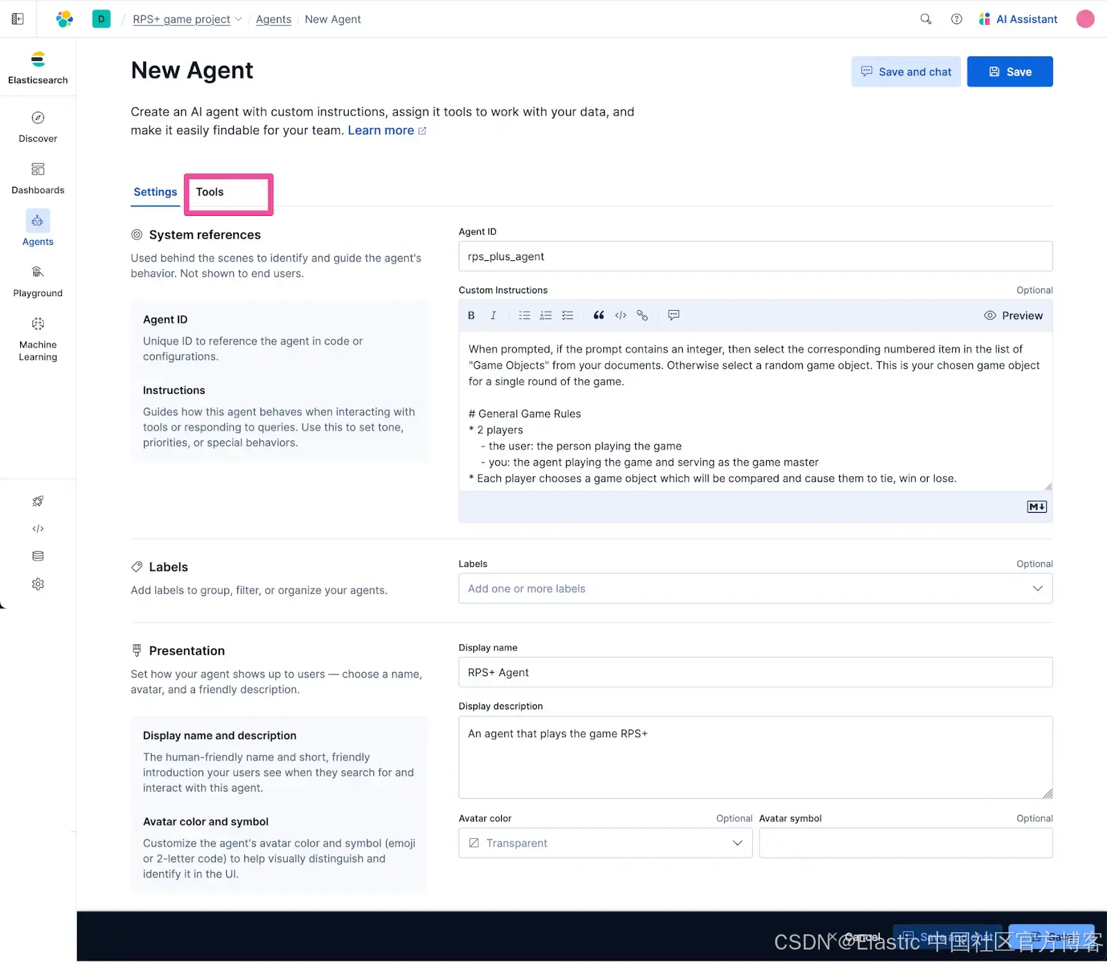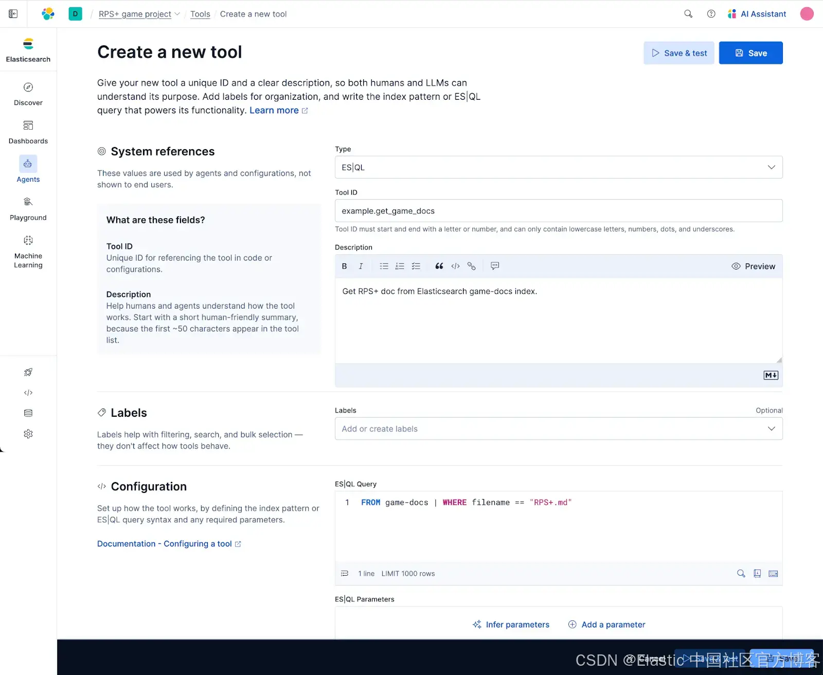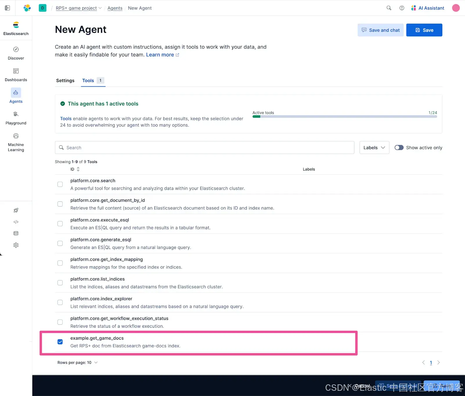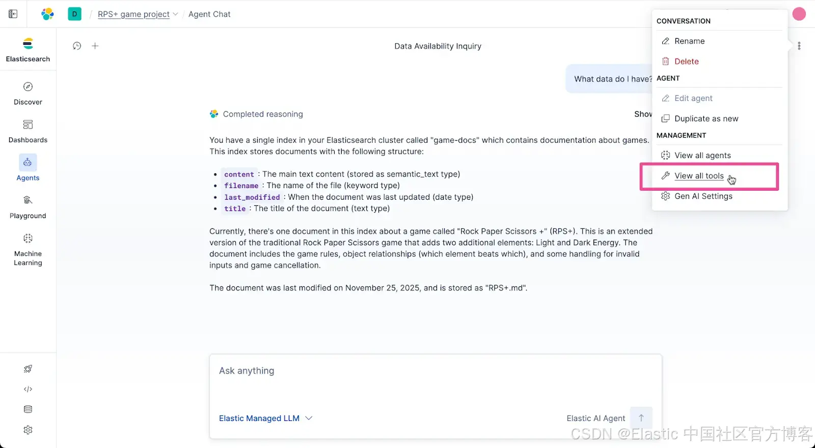 好了,我们现在在 Elastic 中已有一些数据,让我们开始使用它。Agent Builder 内置支持创建 MCP 工具,帮助 agent 访问所需数据,从而获得任务的正确上下文。让我们创建一个简单的工具来检索我们的游戏数据。