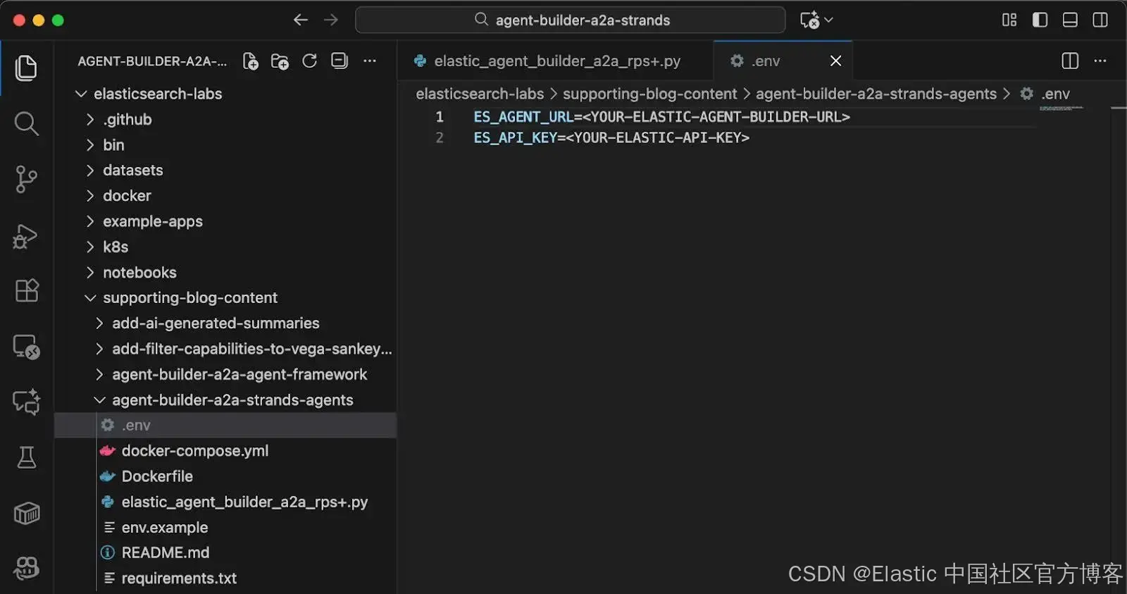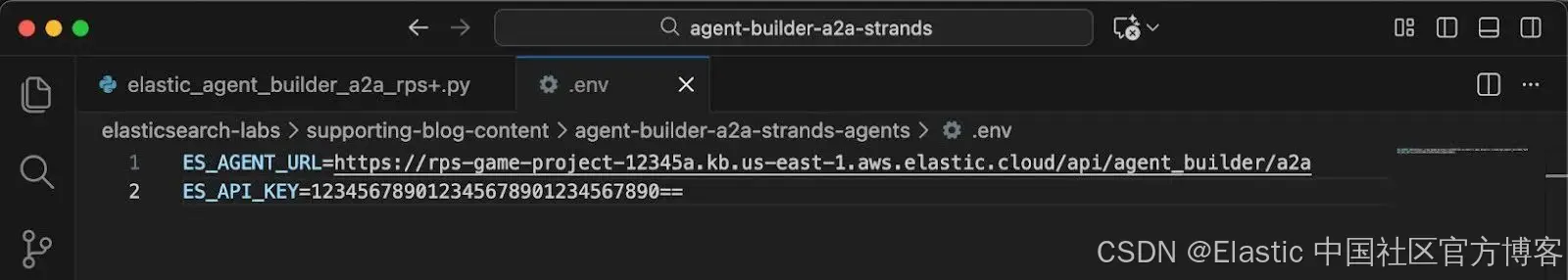 将 MCP Server URL 粘贴到 .env 文件中,替换 <YOUR-ELASTIC-AGENT-BUILDER-URL> 占位符。现在我们需要对 URL 做一个修改,即将结尾的 “mcp” 替换为 “a2a”,因为 Strands Agents SDK 将使用 A2A 协议与运行在 Elastic Agent Builder 中的 agent 通信。