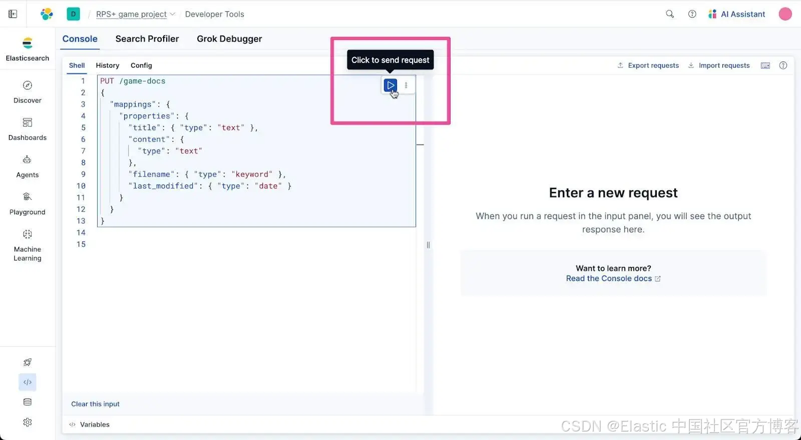 点击 Developer Tools 中语句右侧出现的 Send request 按钮。你应该会在 Developer Tools 的响应区域看到一条通知,确认 game-docs 索引已创建。