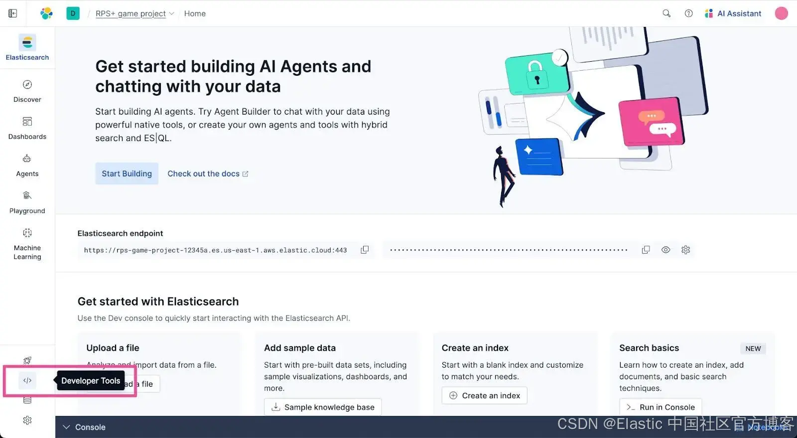 接下来,我们将在 Elasticsearch 项目中添加一些数据。打开 Developer Tools,在这里我们可以运行命令来创建新索引并向其中插入数据。从顶层导航菜单中选择 Developer Tools。