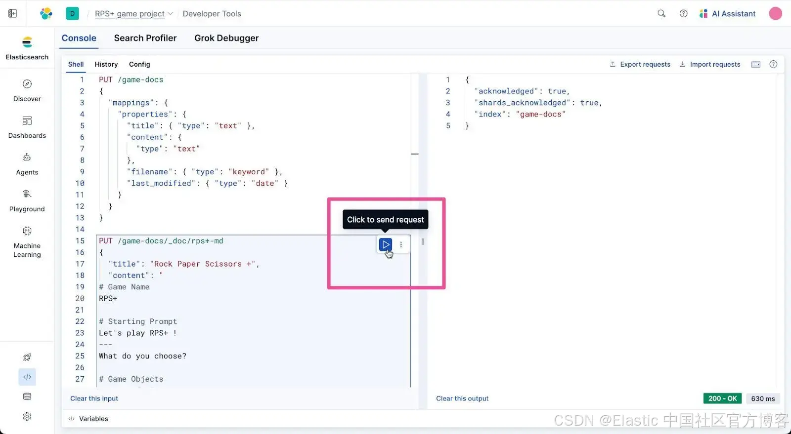 点击语句旁的 Send request 按钮运行它,将 rps+-md 文档添加到 game-docs 索引中。